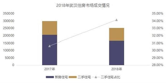 武汉市房管局数据显示,2018年,武汉新建商品住宅成交166362套,较上年下滑13.62%;二手住宅成交量为78868套,较上年下滑6.24%。虽然二手住宅成交套数下滑,但成交占比由2017年的30.64%扩大至34.14%。
