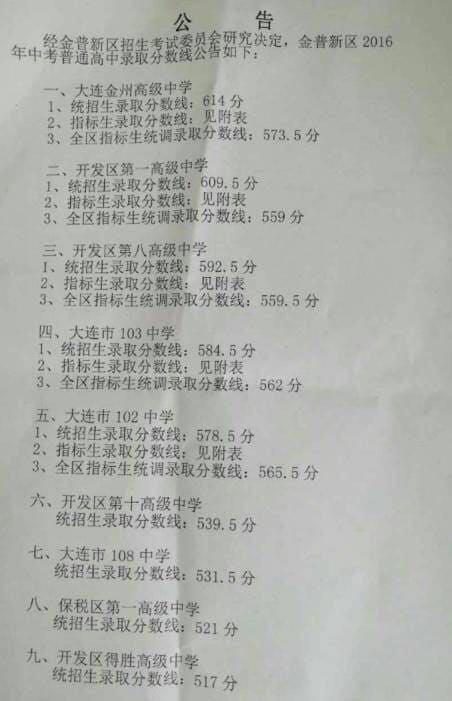 中考成绩公布后,各高中的录取分数线就成了家长最关心的问题。7月22日金普新区公布了2016年中考普通高中录取分数。