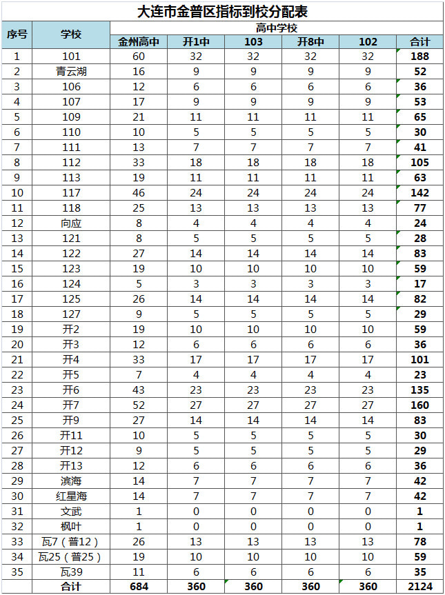 2016年大连市金普新区指标到校分配表